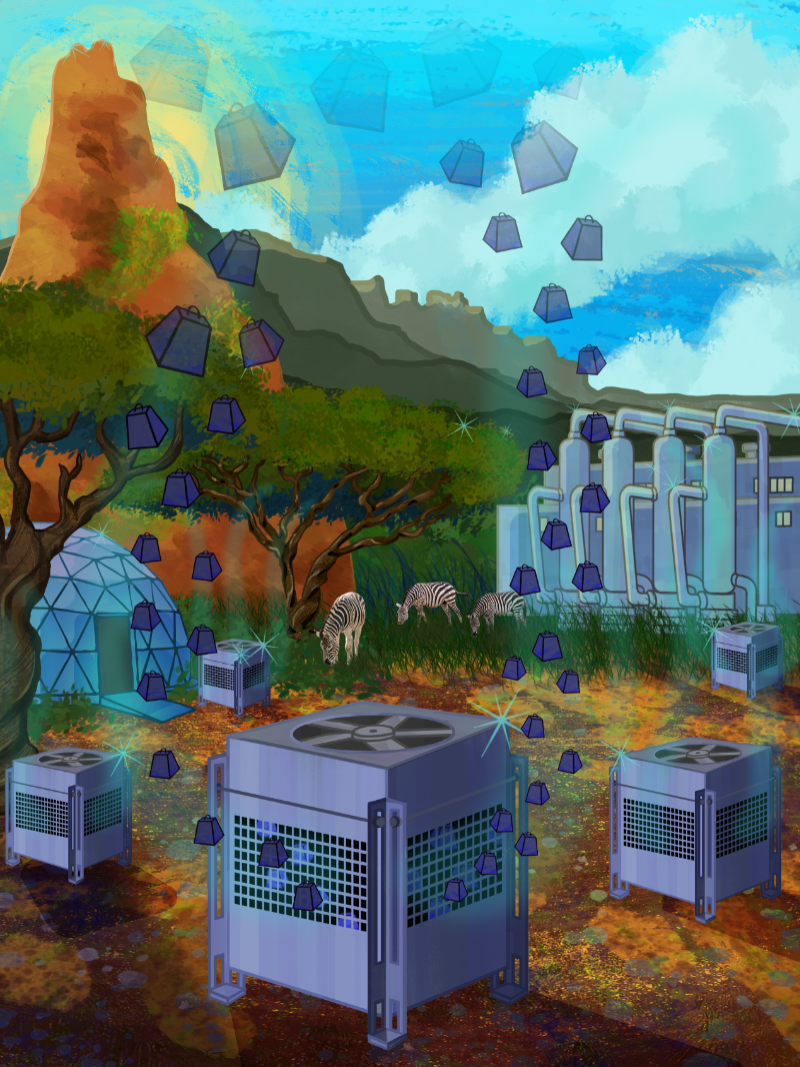 Send personalized greetings with the purchase of our "Hell's Gate, Heaven's Gleam" card that also takes action for the climate. Direct Air Capture is a method of carbon dioxide removal whereby atmospheric CO₂ is sucked directly out of the air. It can then be sequestered durably underground, used to grow plants in greenhouses, or as a substitute for fossil-sourced CO₂ in industrial processes. Select the price point to remove carbon dioxide by the kilos or the ton. Planet Earth thanks you.