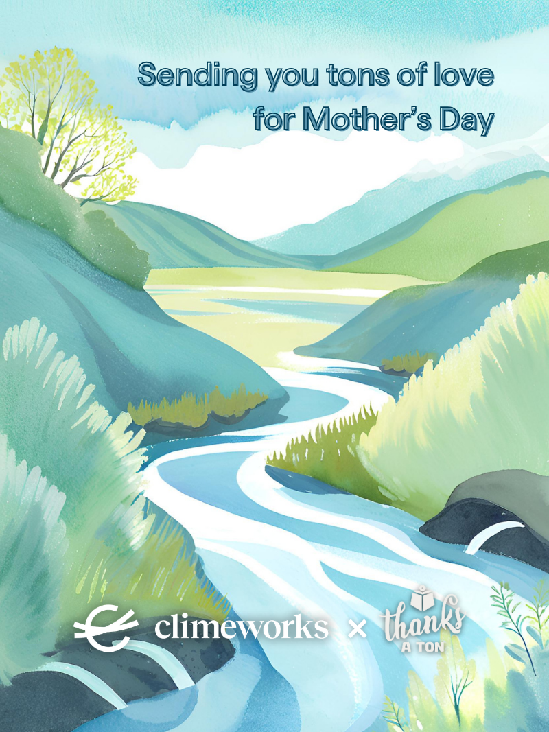 Celebrate this Mother's Day with a river of love and a personalized note of love to Mom with the purchase of our "Tons of Love River 2" card that also takes action for the climate. Thanks a Ton greeting cards include the gift of carbon dioxide removal from the atmosphere and oceans. Select the method and the price point to remove carbon dioxide by the kilos or the ton. Planet Earth thanks you.